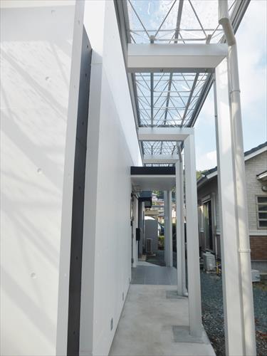 建物の外観にあったお洒落なカーポートをお探しだったF様。車庫4台分と玄関までのアプローチルーフも欲しいとの事でした。そこでご提案したのが三協アルミのMシェードです。Mシェードは敷地や住まいへの対応力が高く、多彩な設計プランが可能です。カーポートから奥に伸びるアプローチルーフが違和感なく納まる様に、高さや連結部の納まり等、十二分に配慮しました。カーポートの存在感を感じさせずに建物のアクセントとして外観をお洒落に演出する事が出来ました。担当:アウトテリアプロデューサー 穴見 栄教
