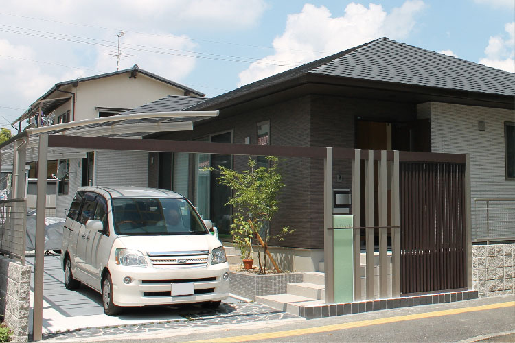 敷地の南側を車庫スペースにして屋根をつけたいとのご要望を頂きましたが、玄関やリビングも全て南向きだったため、暗くならないよう、実用性や意匠性に優れた『Mシェード』を設置しました。隣接するお隣との目隠しも採光タイプの明るいパネルを採用し、プライバシーを守りながらも明るく快適に過ごせる空間が誕生しました。