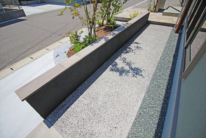 植栽帯と建物の間がアプローチとなっていて、玄関と駐車スペースを繋ぎます。