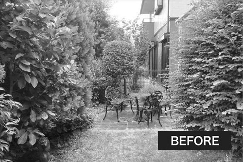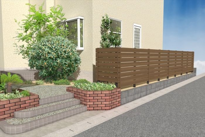 大きく茂っていた生垣は撤去し、新たな目隠しとして樹脂フェンス『グローベン:プラドone』を設置します。天然木のようなリアルな風合いで、既存のナチュラルな雰囲気を残しつつしっかりと視線を遮ります。