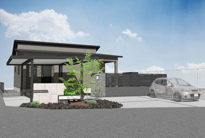 お庭は隣地側と南側を目隠しフェンスでしっかり囲いプライベートな空間を確保しました。カーポートは玄関前に設置するので雨の日も濡れずに行き来でき、利便性を追求しております。