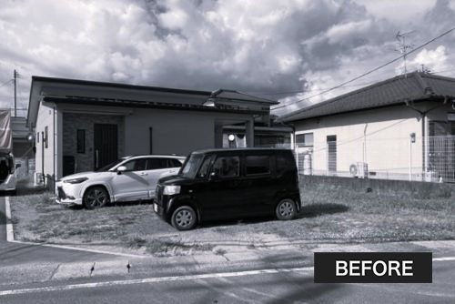 南北に延びる長方形のお土地の中央に建物があり、南側の主要道路に向かって玄関があります。手つかずだった外構がお悩みでした。