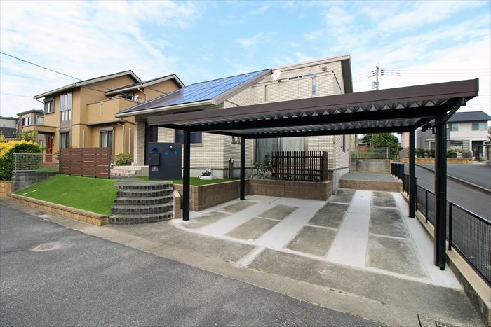 お住まいが高台で風が強いため、カーポートは折半屋根をセレクト。木調のアクセントカラーがお洒落です。