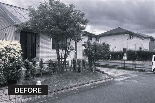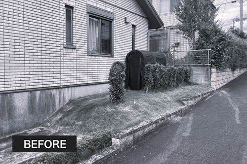 傾斜地に建つ施主様邸の外構は高低差を解消するため天然芝の法面が四方を囲うナチュラルな風合いでしたが、芝の管理にお困りだったため建物や道路際は化粧ブロックで土留めを行い、法面部を減少させました。天然芝は人工芝へ。樹木も撤去して、目隠しフェンスですっきりとしたファサードが印象的です。
