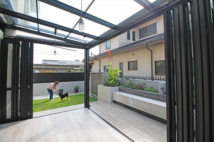 ワンちゃんが伸び伸び快適に過ごせるように、お手入れにかかる時間をもっと有意義に過ごせるように、ガーデンルーム『LIXIL:暖蘭物語』の設置を希望された施主様。お庭の半分は美しいタイルスペースとし、半分は天然芝を残してワンちゃんが思う存分駆け回れるお庭となっています。