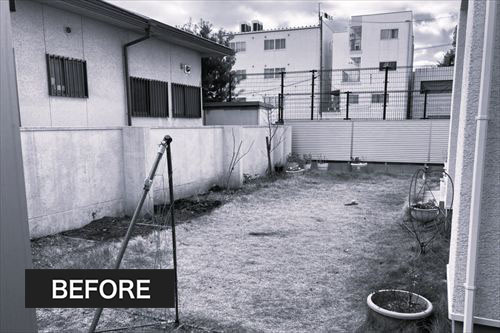 天然芝が広がる以前のお庭。土堀りが好きなワンちゃんはすぐにどろんこになり、ご多忙の施主様はお手入れの時間が取れずメンテナンスにお困りでした。