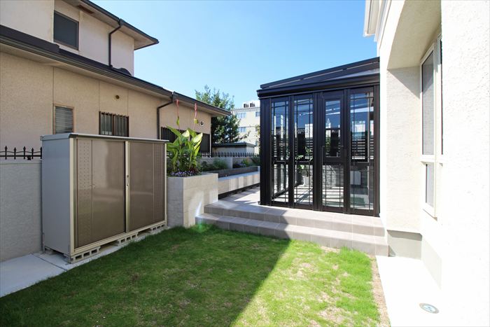 ルーム前にはお花が大好きな奥様のために花壇スペースを設け、お手入れしやすいようベンチをご提案。何気なく腰掛け、語らえる空間をとても気に入って頂きました。