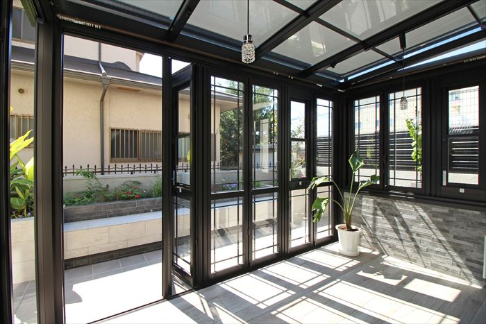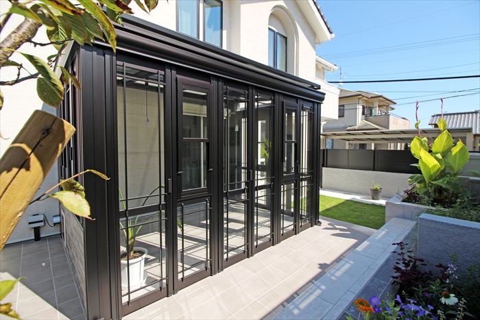白い建物に黒いガーデンルームがよく映え、ラグジュアリーな空間が素敵です。