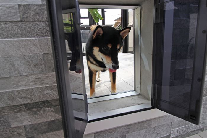 小窓に慣れず、飛び出す勇気がなかなか出ないワンちゃん。とってもキュート♪
