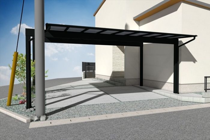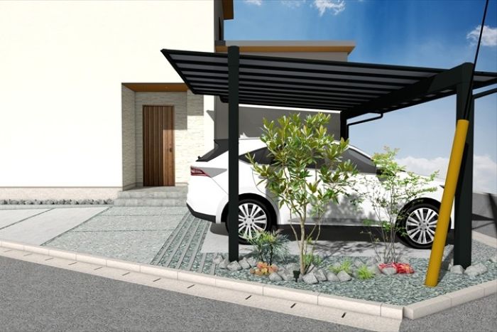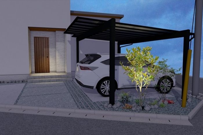 カーポートは『三協アルミ:スカイリード』を梁延長仕様で設置します。運転席側の柱を車から離すことで車の乗り降りがしやすいよう考慮しました。