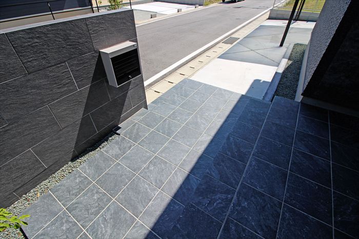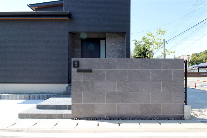 門柱は敢えて幅広にデザインし、玄関の目隠しを兼ねます。ダークトーンのタイル張りでかっこよく落ち着いた雰囲気を演出しました。