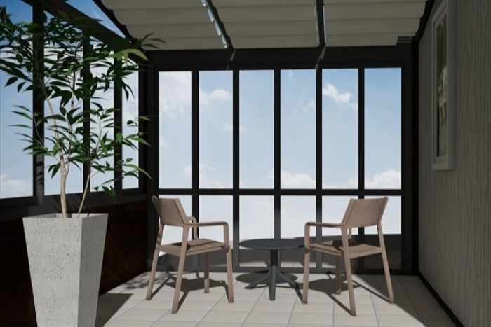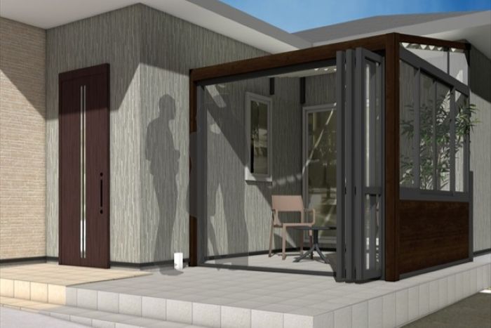 新設するガーデンルームは正面は解放のある折戸仕様、 側面は腰壁+高窓仕様となっています。
