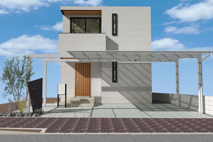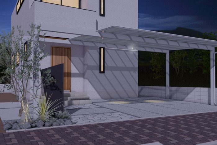 2台分のカーポートをメインにしたリゾート感を感じさせるデザイン。 夜には門柱に添えた『ガラスマテリアル:INGOT』が優しく光り、通る人の目を楽しませてくれます。