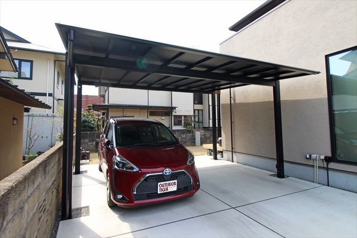 新設するカーポートとサイクルポートはブラックポリカに統一し、シックな門廻りに調和させました。