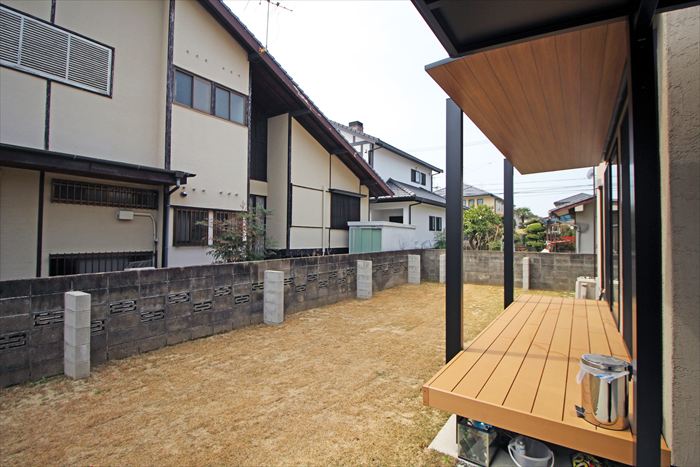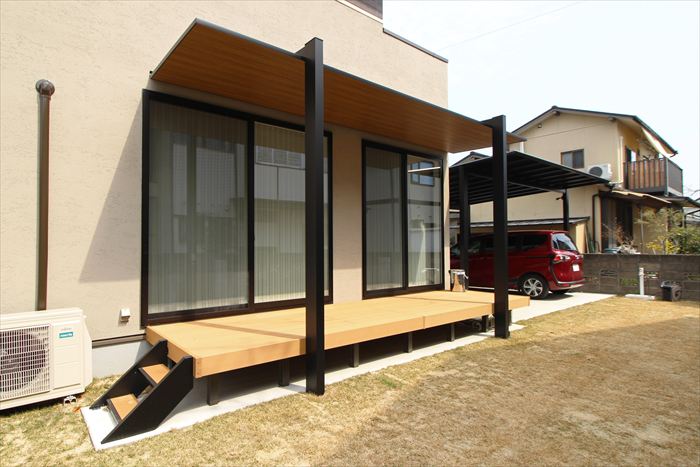 テラス屋根は『LIXIL:テラスSC』を希望され、屋根色を木調にすることで建物との調和を図っています。デッキはテラス下にしっかり納めました。