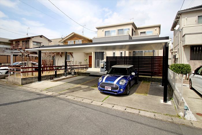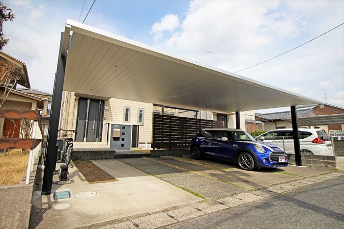 車庫スペースにカーポートを新設しました。選ばれたのは『LIXIL:カーポートSC』です。広い車庫スペースを覆う3台用の屋根は圧巻で、雨の日も濡れずに車の乗り降りができて快適な車庫空間となりました。