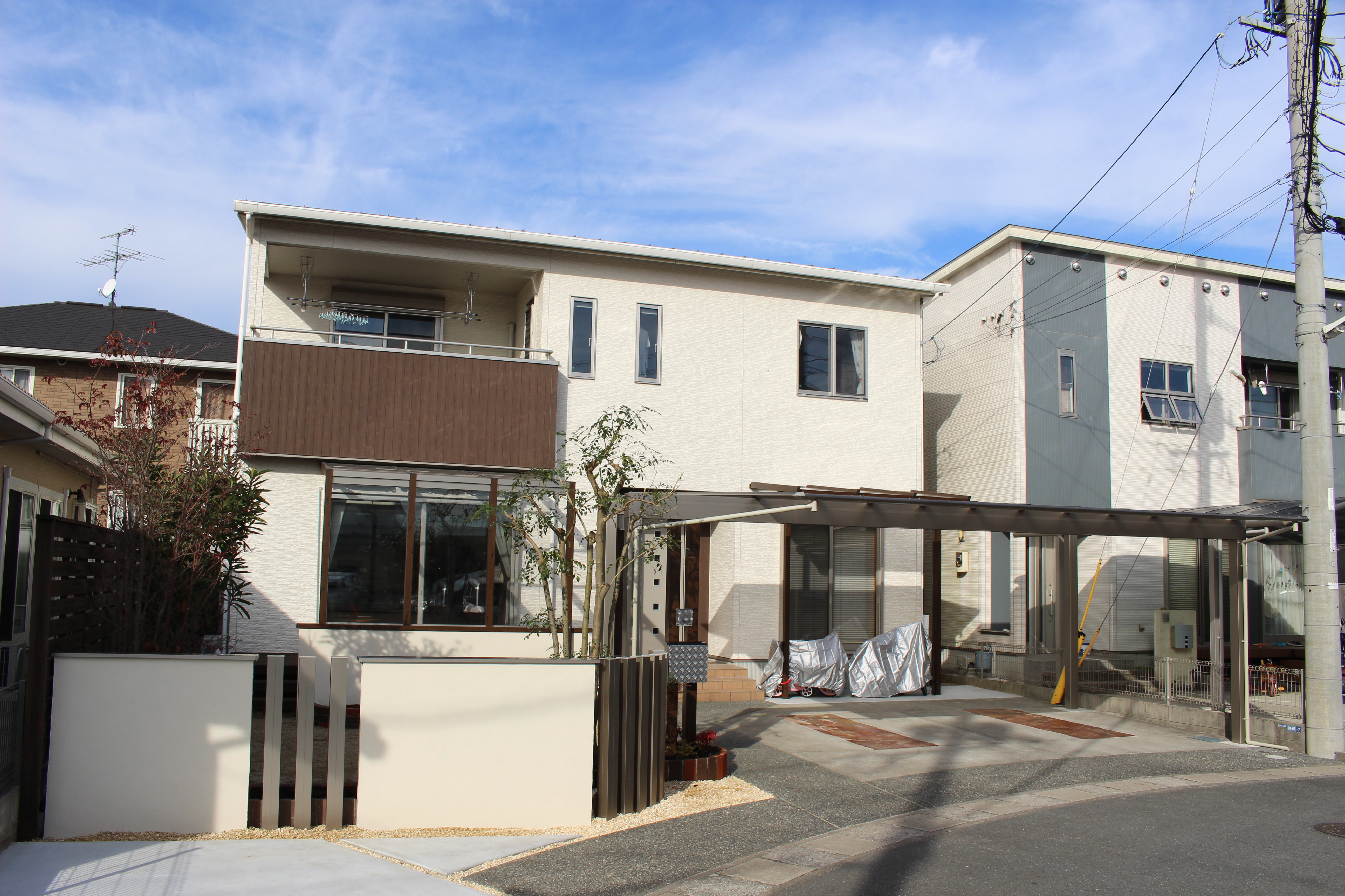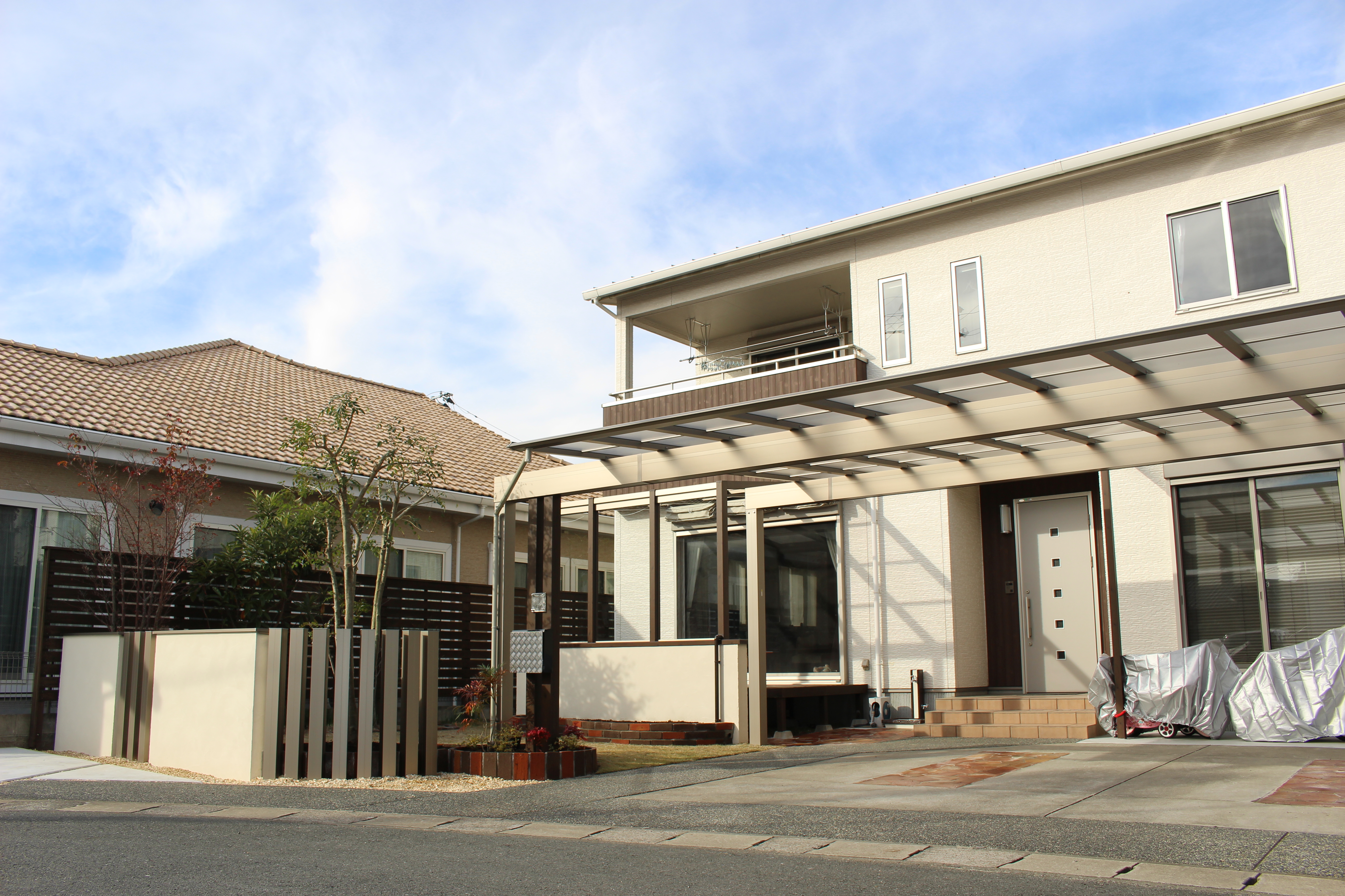 前面のウォールも テラス の腰壁と合わせ、一体感のあるデザインに