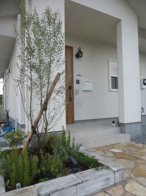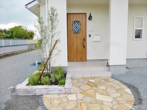 アクセントの乱形自然石は玄関ドアと色を合わせることで