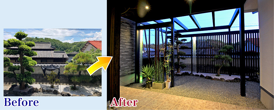 先代から受け継いだ古き良き時代の和のお庭に物足りなさを感じておられた施主様より、部屋からの景観を美しくしたいとご相談を頂きました。高級感溢れるお庭になるよう『軒』をイメージしたテラス空間を希望されたことから、天井材の屋根を用いることでリビングからの繋がりを意識しました。その先にフレームを伸ばすことでお庭に奥行感を演出し、スリット部材による2種類の目隠しでお部屋からの景観を美しく仕上げています。程好い日差しと日陰を感じられるプライベート空間。和の趣きを大切にした新しいお庭をとても気に入ってくださった施主様は、これまで締め切っていたカーテンを開け放ち、一日の大半を庭を眺めながら過ごしているのだとか。穏やかな日々に幸せを感じているそうです。