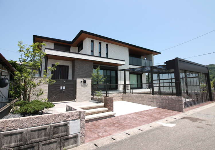 広い敷地にホワイトのシンプルモダンな建物が建ちます。外構も縦格子で直線をメインとしたシンプルな構成ですが、『プラスG』にてフレームをかけることで、立体感と奥行感を生み出しました。また、植栽があることによってその効果が倍増され、建物との一体感もより高まります。