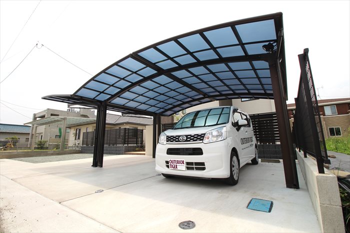 道路からの視線が気になるU様は、高さのある門柱とフェンスでしっかりとした目隠しを施したクローズ外構を希望されました。門柱に建物と同じタイルでアクセントを加えることで建物との統一感を、足元にはガラスの照明『一条の光』で華やかさを演出しています。お広いお庭のなかにゆったりと横たわるアプローチで、更なる奥行感が生まれました。