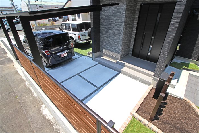 旗竿地にご新築されたO様。アプローチを兼ねた車庫スペースにはカーポートと門柱を設置しましたが、隣接するお隣の視界を遮らないことを第一に、ご自分たちの動線もしっかりと考えて、ベストな位置をO様と決定しました。建物の雰囲気に合わせてモノトーンで統一したファサードの奥には、O様がご自分で敷き込んだ人工芝の緑が煌めきます。
