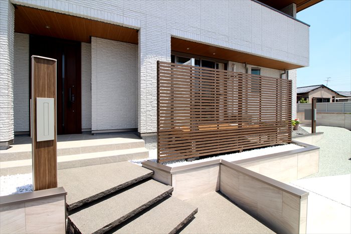 元々あるブロックで象られた外構に彩りを添えるお手伝いをしました。使用したのは高耐候性のラッピングシートを貼ったアルミ製建材パネル『エバーアートボード』です。木目調や大理石風の柔らかな表情がお広い敷地を優しく包みます。 二世帯でお住いのためそれぞれの入り口のポストを建て、リビング前には目隠しフェンスで囲ったデッキ空間もご提案しました。侵入口には生き生きとした表情を湛える溶岩石の門柱を構え、訪れる人を優しく迎え入れます。