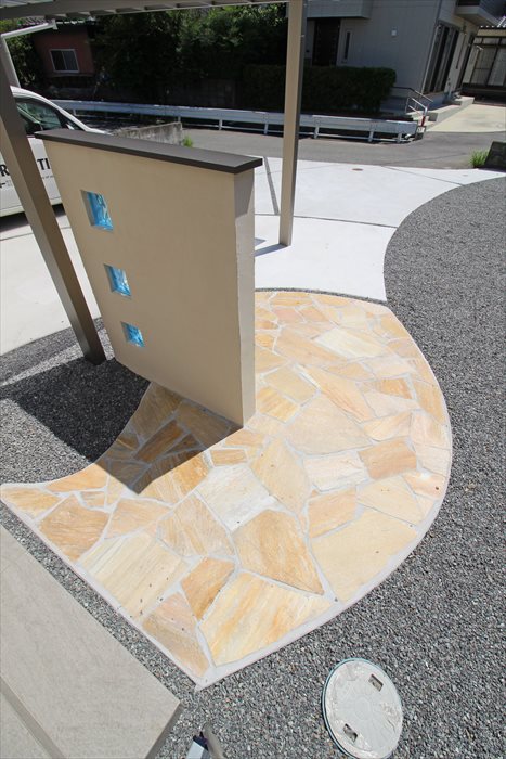 玄関前にあしらわれた木調の外壁が特徴的な建物の風合いに合わせ、門柱には茶色い笠をかぶせてナチュラルな雰囲気に仕上げました。空色のガラスブロックが爽やかな夏の薫りを運びます。お広い車庫スペースは土間コンクリートで仕上げ、単調にならないようアールのデザインをプラスしました。
