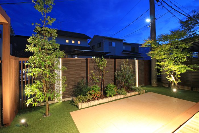 以前ご紹介したM様邸の夜の風景です。夜の帳が降りる頃、随所に設置した照明が光り輝き、昼とは違う幻想的な表情を湛えます。