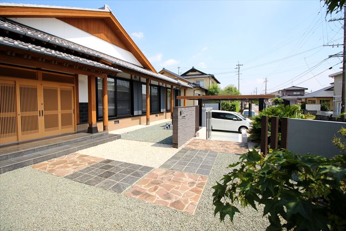 以前外構工事をお世話になったM様。今回はカーポートのご依頼を頂きました。広い駐車スペース全体にお屋根をかけたいとのことで、広域な間口に対応できる『Uスタイルアゼスト』をご提案。木調の屋根枠を採用することで、存在感のある和風の建物と見事に調和しました。