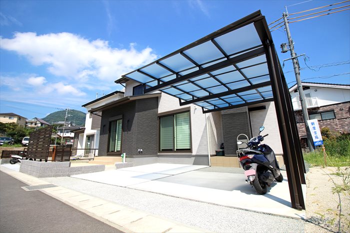 カーポートは車1台と自転車が停められるよう、間口サイズが一番大きなものを採用しました。雨に濡れずに玄関への行き来ができるよう、建物に出来るだけ寄せて設置しています。お庭には道路からの視線をカットする目隠しフェンスも設置。お部屋からお庭への出入りがスムーズになるよう、玄関ポーチと同じタイルのステップも完成しました。