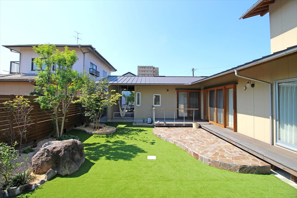 天然芝とたくさんの樹木に囲まれた自然豊かなお庭のお手入れにお困りだったH様。樹木を選定し、天然芝は人工芝へチェンジすることで、自然の風合いを大切にした使い勝手の良いお庭へと生まれ変わりました。既存のデッキから続く石張りのテラスは緑との相性もよく、 木調のフェンスで周囲からの視線をしっかりと遮っているのでゆっくりお過ごし頂けます。