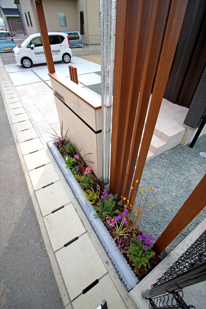 玄関前の目隠しを兼ねた門廻りをご提案しました。大判のタイルを貼った存在感のある門柱にフレームを合わせ、長く伸びた縦格子やガラスマテリアル『インゴット』が空間にインパクトを与えます。横ラインが印象的な車庫土間には、門柱の雰囲気を大切にしたアプローチが横たわり、モミジの彩りが優しい影を落とします。