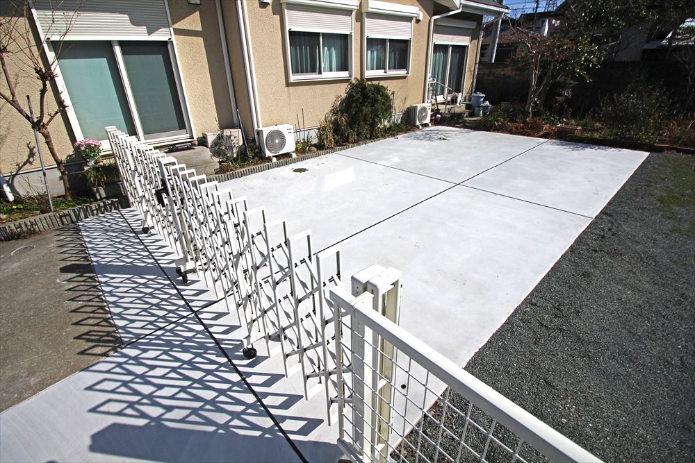 既存の駐車スペースをもっと使いやすく…。まずは既存のブロック塀を一部解体して進入口を広げることで、車の出し入れがしやすくなりました。前面道路が狭いため、新設した伸縮ゲートの前には車を1台横付けできるスペースを確保。ゲートの開閉の際には車の往来を気にせず、ゆっくりとゆとりをもって頂けると思います。駐車スペースには全面にコンクリートを施工し、足元が汚れる心配がありません。