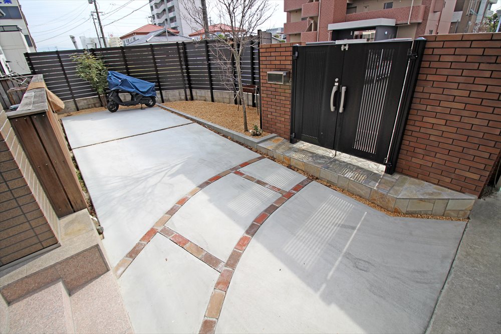 お車3台をゆっくり駐車できるよう、既存のお庭を駐車スペースへ。芝生や石貼りのアプローチを撤去してコンクリートを施工しました。玄関前の階段は既存のポーチに掘り込む形で新設しています。撤去した生垣に代わり、外からの視線を遮るのはシックな色合いの樹脂フェンスです。活用されていなかったお庭がすっきりとした車庫スペースへと生まれ変わりました。