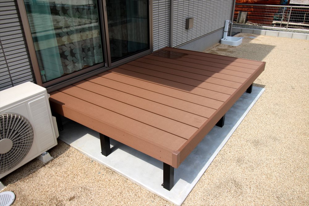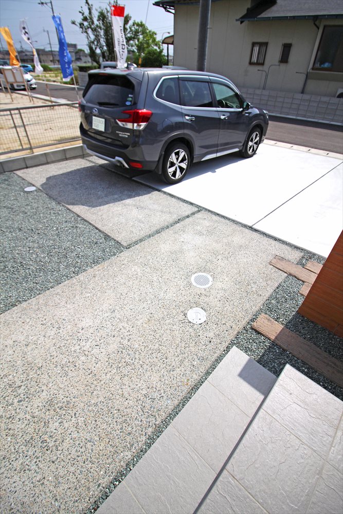 建物前に広い車庫スペースを確保したシンプルなオープン外構です。玄関の目隠しを兼ねた門柱にはレッドシダー調の美しい木目タイルを施工し、足元に横たわるコンクリート枕木やリビング前の人工木デッキなど、木調の風合いが真新しい建物を優しく彩ります。