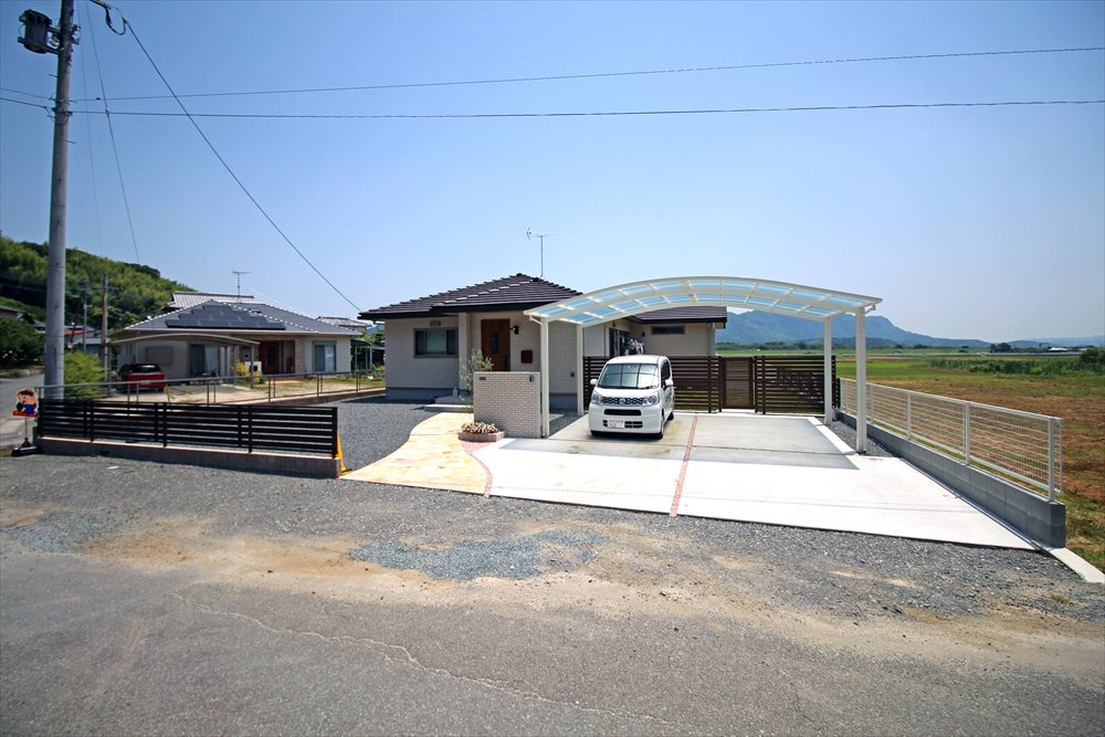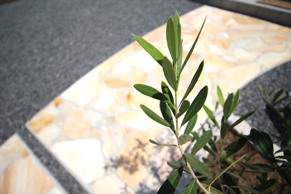 お広い敷地にゆったりと横たわるアプローチがポイントのオープン外構です。煌めく自然石の床面に、シンボルツリーが優しい葉影を落とします。建物と同じタイルを使用した門柱がアクセントとなりました。車庫とお庭の境界に目隠しフェンスを施すことで道路からの視線をしっかり遮り、お庭のプライベート空間を演出しています。
