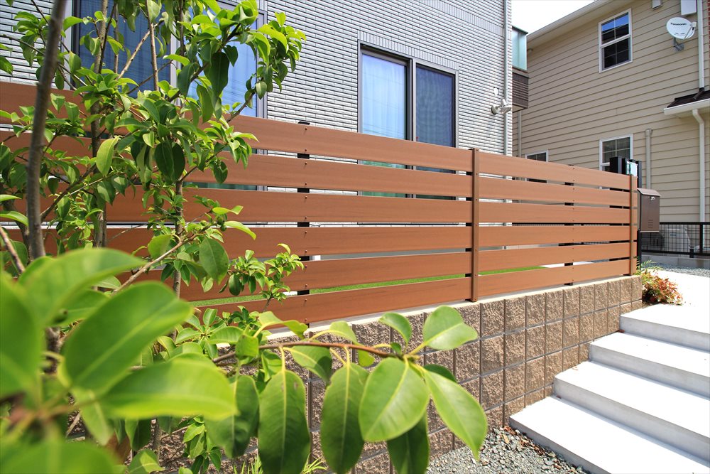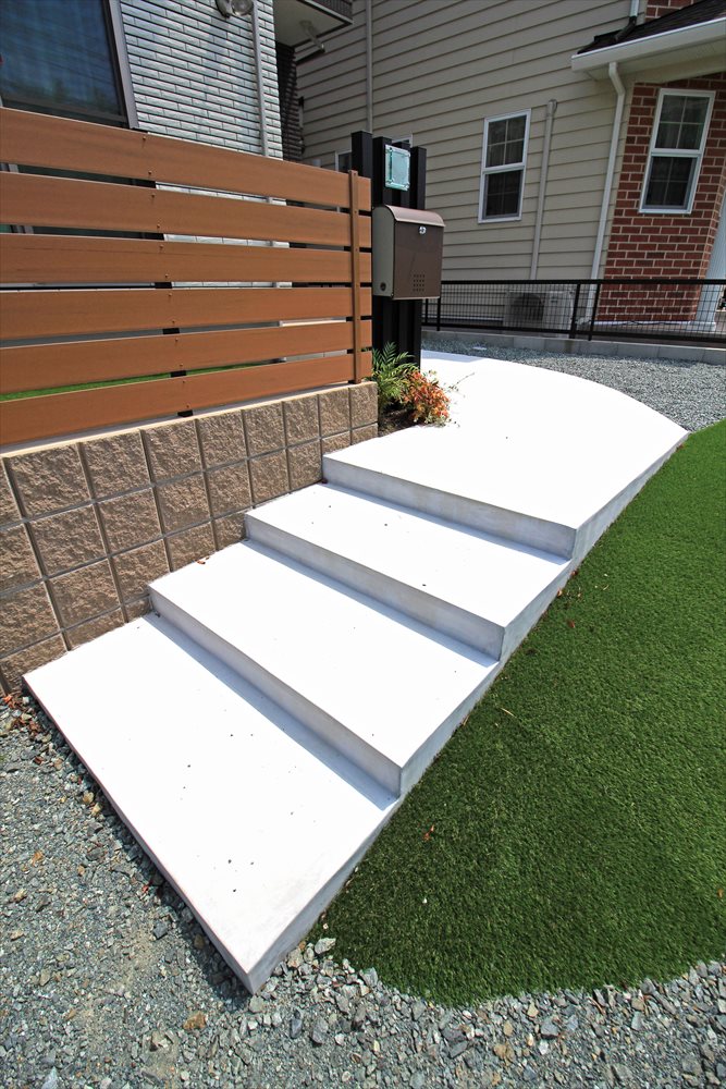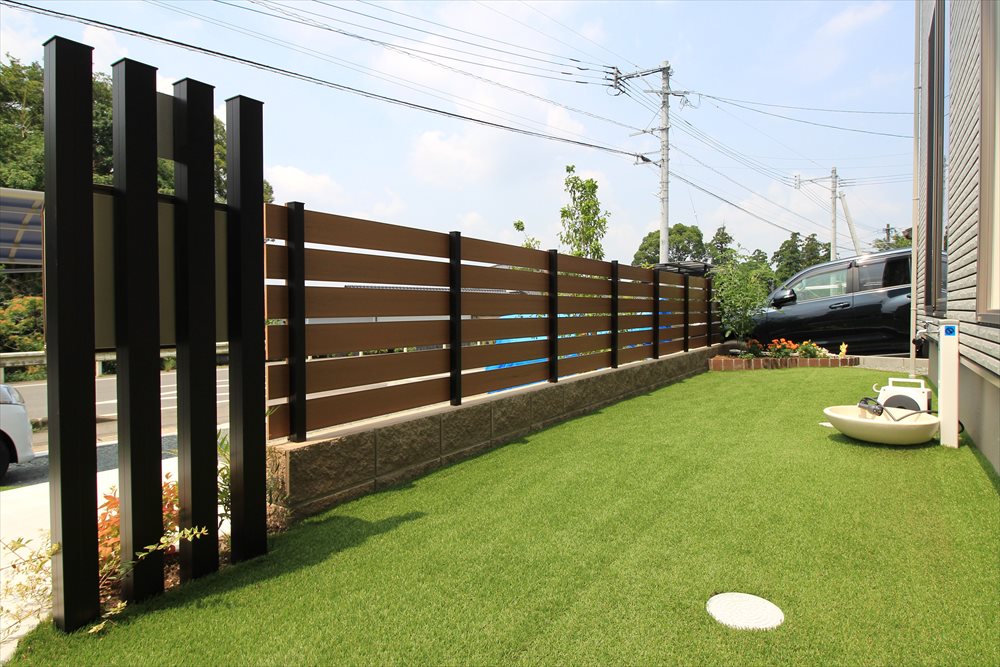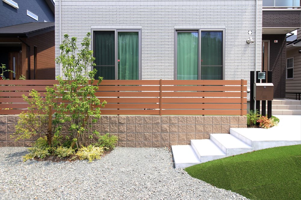 木調の温もりとグリーンが調和した、優しい風合いのオープン外構をご提案しました。人工芝を張った法面や蹴上げの低いゆったりとしたアプローチステップで敷地内の高低差を緩和しています。ガラスの表札の煌めきが涼を運びます。