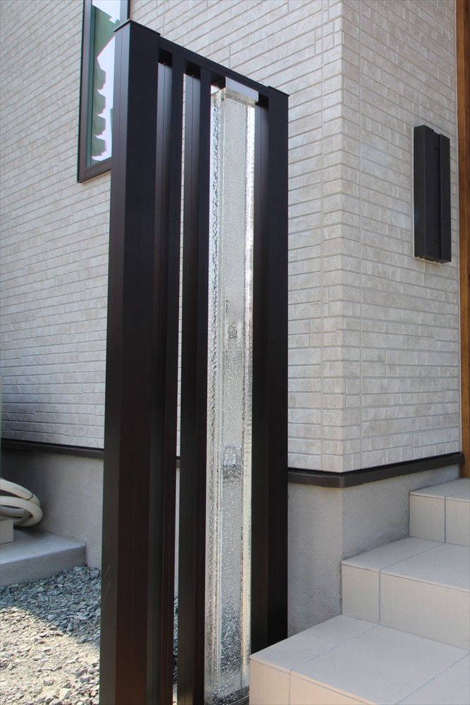 ご実家の敷地内にご新築されたH様。ご実家と併せて車庫計画を行い、ご自宅のファサードをご提案しました。角柱を用いた門柱にはガラスマテリアル『インゴット』が煌めき、名前を彫って表札として使用しています。シンボルツリーには人工植物を使用しており、本物を超える表情と質感がファサードを鮮やかに彩ります。
