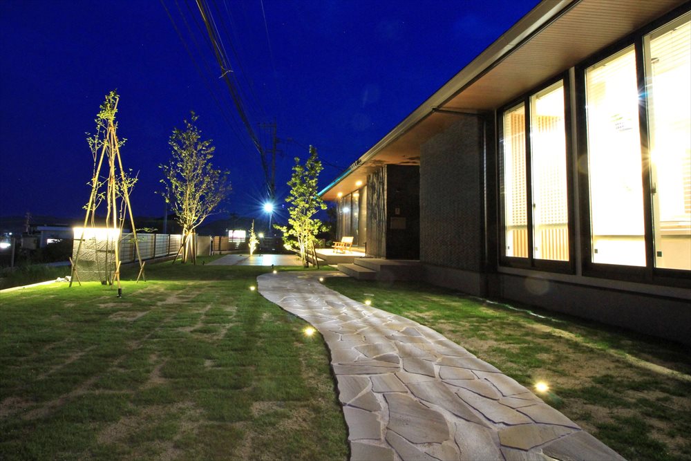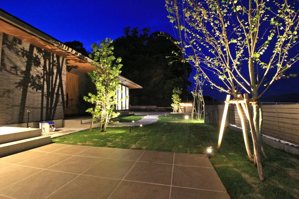 以前ご紹介したM様邸の夜の風景です。お庭に配したスポットライトの小さな光は、夜空で瞬く星のよう。優しい光がお庭を彩ります。