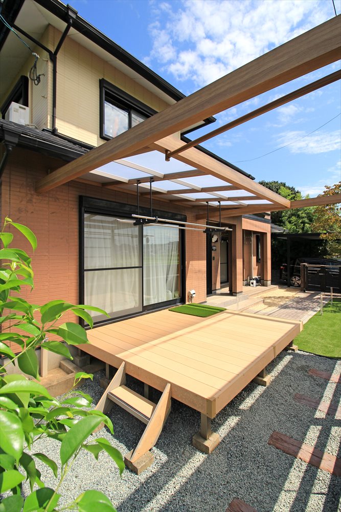 樹木を整理してすっきりと、また既存のウッドデッキにはテラス屋根を付けたいとご依頼を頂きました。デッキの屋根には『LIXIL:+G』を採用。フレームを組んで骨組みを作り、デッキを覆う屋根をかけ、正面には目隠しとなるスクリーンを設置しました。植栽に覆われていた庭には人工芝を敷き込み、アプローチにはガラスの照明『一条の光』が寄り添います。爽やかな人工芝の緑が美しい、使い勝手の良いお庭へと生まれ変わりました。