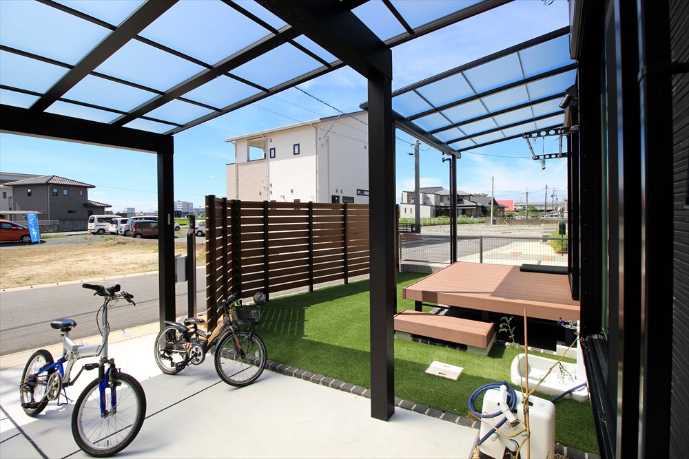 3台分の駐車スペースをカーポート『YKK:エフルージュトリプルFIRST』。広い間口は使い勝手がよく、ストレートラインのすっきりしたシルエットが真新しい建物を引き立てます。お庭にはテラス屋根と人工木デッキを設置し、柔らかな人工芝でお庭一面を彩りました。プライベート空間を確保する背の高い目隠しフェンスから、子どもたちの笑い声が溢れます。