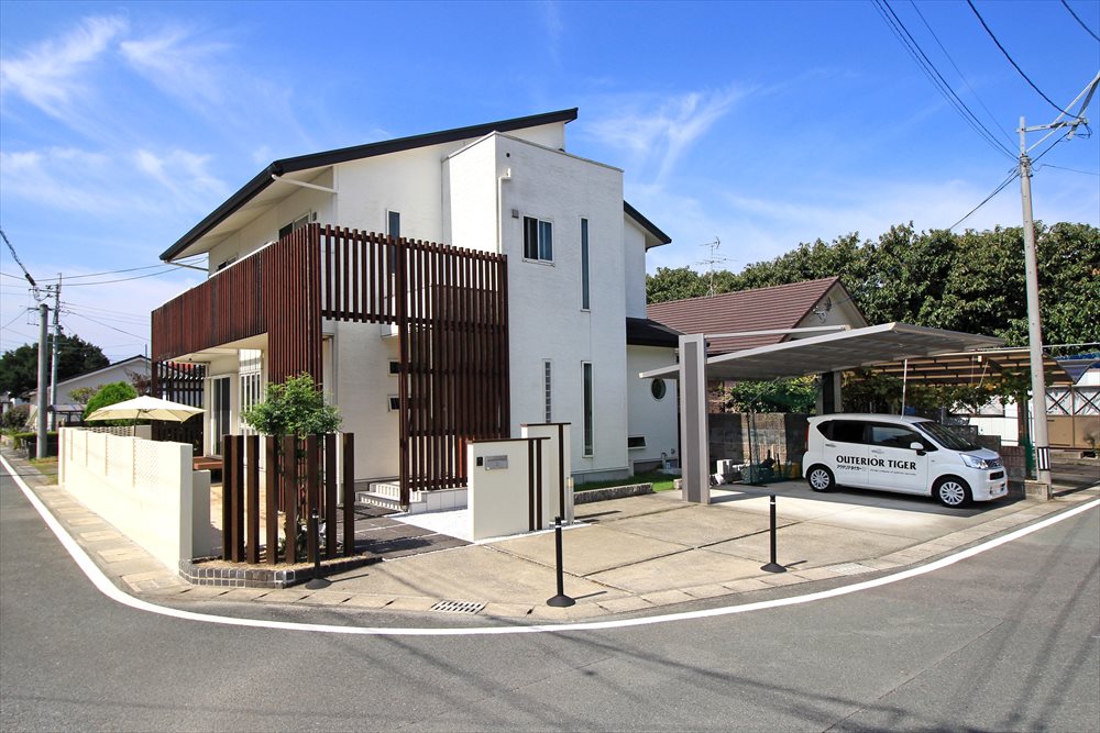 新設した外壁は光と風を通すデザイン性の高いスクリーンブロックで圧迫感を軽減し、華やかな仕上がりとなりました。元々あった天然木のデッキは人工木デッキへと生まれ変わり、外壁に囲まれることで静かな時間が流れます。既存の門柱を外壁と同じ色で塗り直すことで、新旧が融合したエクステリアとなりました。