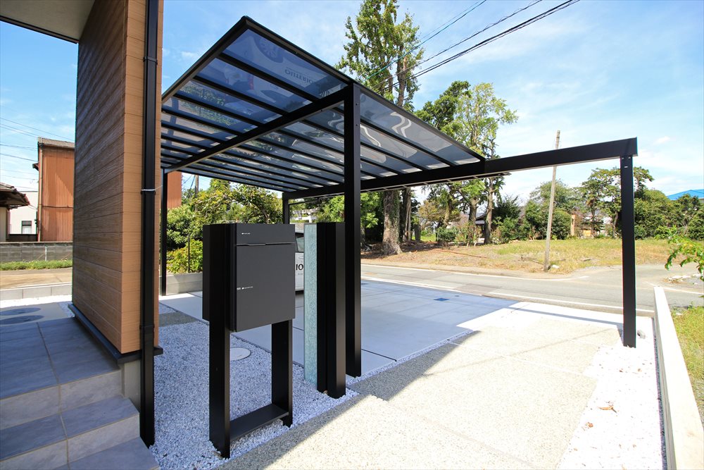 2台分のカーポートは『三協アルミ:スカイリード』を設置し、前方の梁を間口いっぱいに伸ばすことでゲストスペースを確保しつつ、車の進入を妨げないすっきりとしたデザインとなっています。ガラスマテリアル『ティンクル』に名前を刻み、玄関前を華やかに演出しました。前面道路は交通量が多いため見通しを良くするミラーも設置。使い勝手のよい車庫スペースをご提案しました。