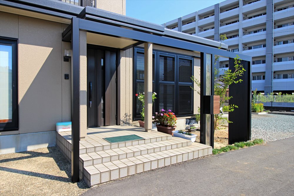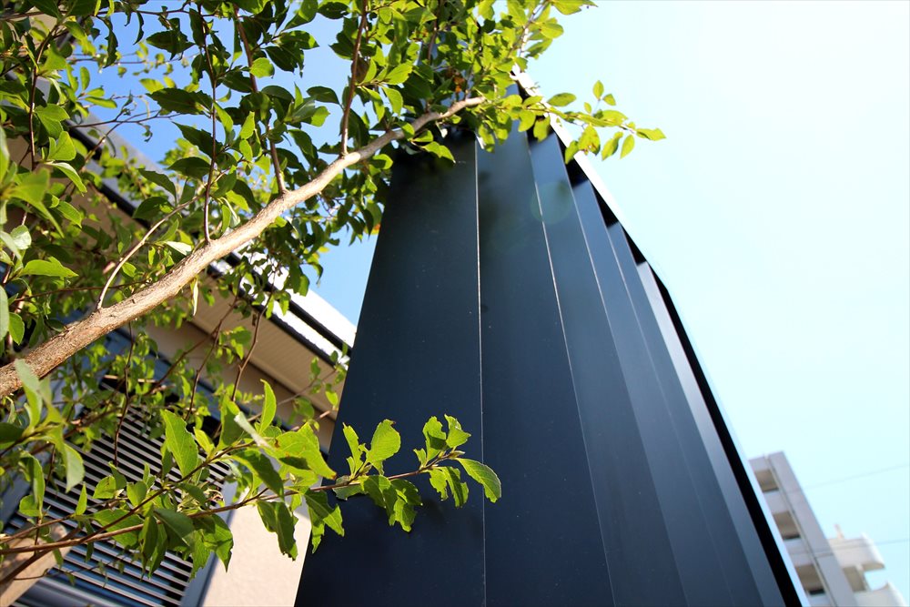 玄関前に新設した大きなアーチ。ガラスマテリアルに名前を刻んで門柱として、またリビングの窓の前に格子材を配して目隠しとして、ゆるぎなく佇む姿が印象的んです。シンボルツリーのヒメシャラの柔らかな葉色、施主様が大切に育てられている色とりどりの草花が、ファサードを華やかに彩ります。