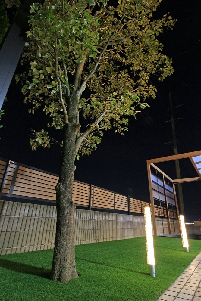 アプローチ脇に設置したガラスの照明『一条の光』が柔らかな光を灯し、アプローチを優しく照らします。