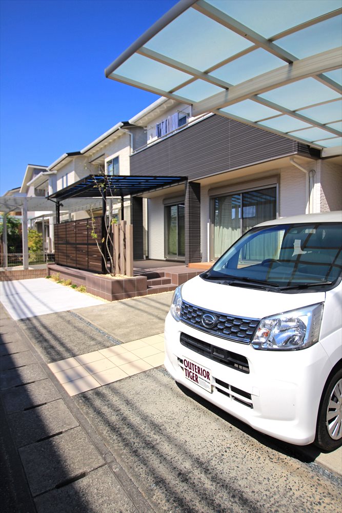 リビング前に広がっていた天然芝と道路側を覆う生垣。それらを撤去し、タイルテラスを大きく広げたガーデンリフォームを行いました。生垣に代わる目隠しとして形材フェンス『三協アルミ:シャトレナM1型』で空間を囲い、大きなテラス屋根を合わせたプライベート空間をご提案。前面には新たにゲストスペースを確保し、お手入れの要らない使い勝手のよいお庭へと生まれ変わりました。
