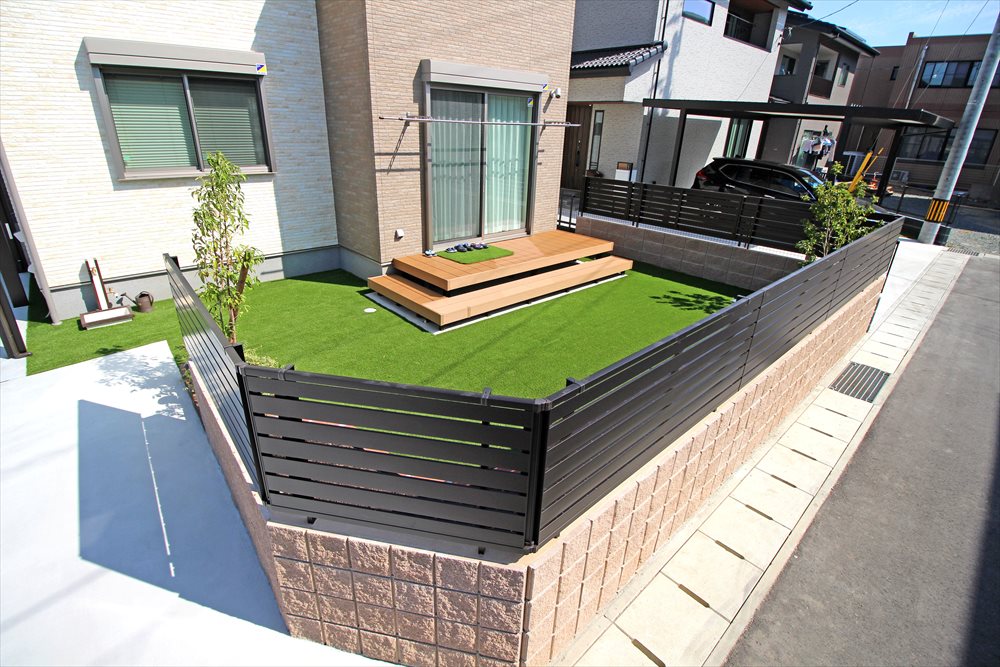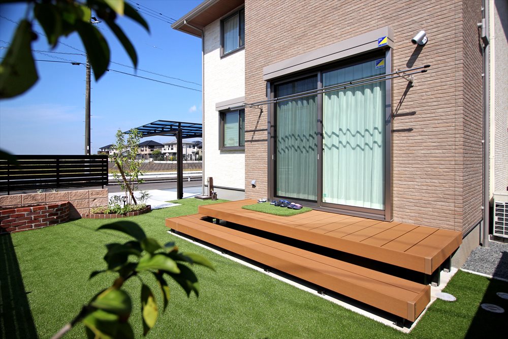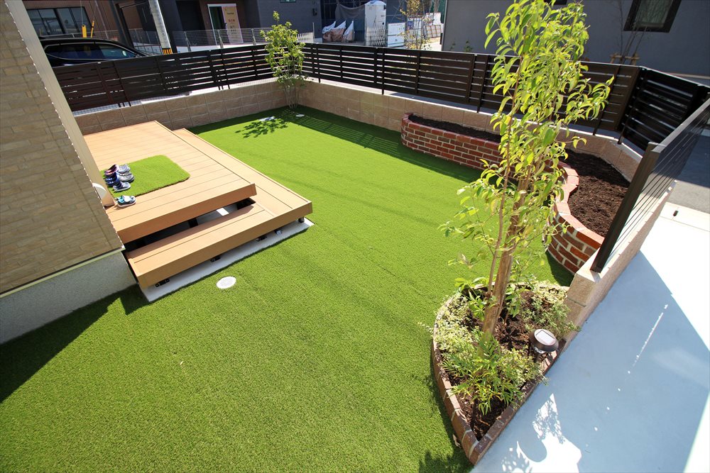 以前ご紹介したM様邸のガーデンです。雑草対策をメインにお庭一面に人工芝を敷き込み、人工木デッキが建物とお庭を繋ぎます。車庫からお庭へ、段差なく続くお敷地をお子様たちが元気に駆け回ります。赤いレンガの花壇がお庭のアクセントとなりました。