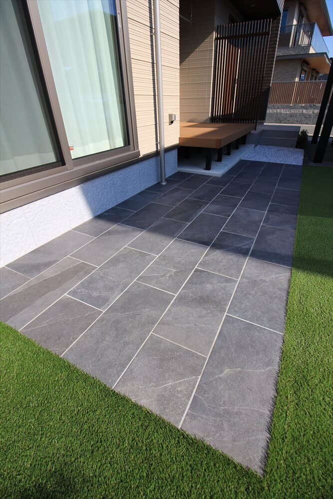 美しく街並みに調和する『LIXIL:カーポートSC』。シンプルなフォルムは建物を引き立て、植栽の緑がよく映えます。山砂のお庭には人工芝を敷き込み、目隠しフェンス、駐輪スペースなど、必要なものを整えることで、使い勝手のよいお庭へと生まれ変わりました。