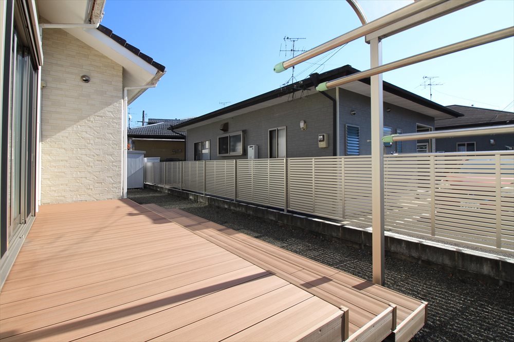 進入口に新設した門柱は、ガラスマテリアル『ティンクル』が主役です。煌めくエメラルドグリーンが爽やかにお客様を迎えます。人工木デッキの設置に伴い、一緒にご依頼頂いたファサード工事。お庭もファサードも生まれ変わり、お家を引き立てています。